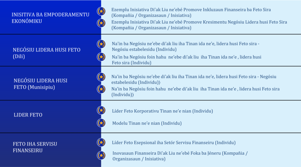 9. Líder Feto Esepsional iha Setór Servisu Finanseiru (Individu): Rekoñese feto ne’ebé hatudu ona lideransa diak iha setór servisu finanseiru, no lori impaktu no mudansa signifikativu.